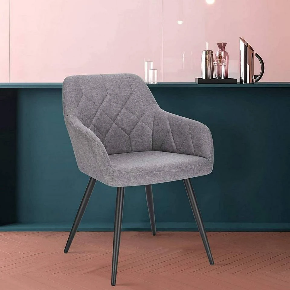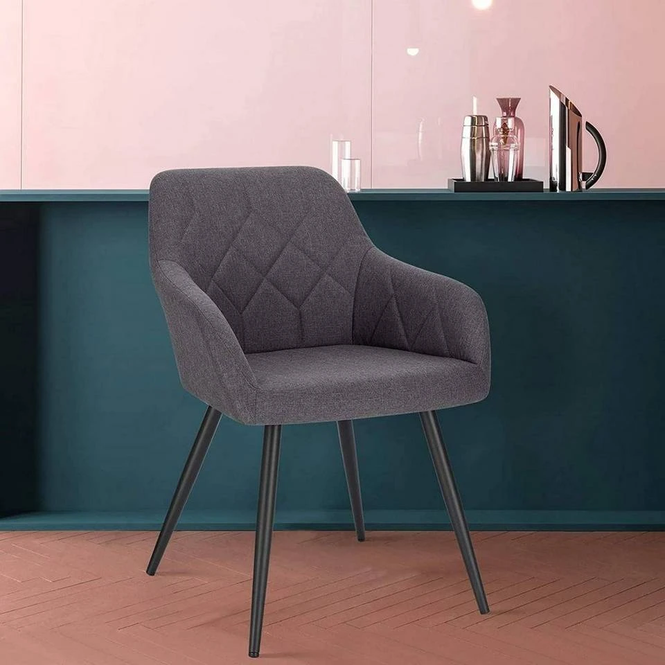 - Dieser Esszimmerstuhl mit Rautengittermuster ist schlicht und kombiniert den modernen Leinensitz mit verjüngten Retro-Metallbeinen, wodurch ein stilvolles Aussehen geschaffen wird.