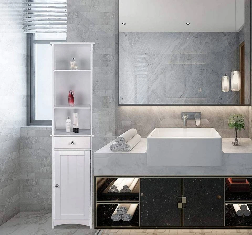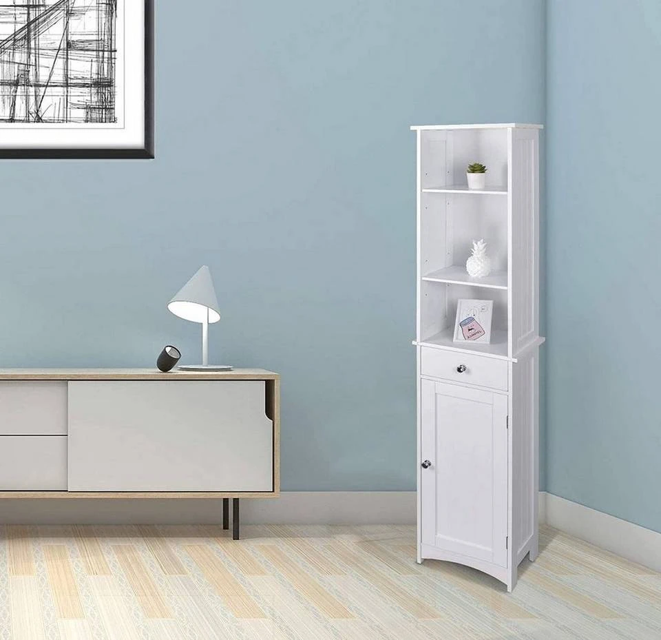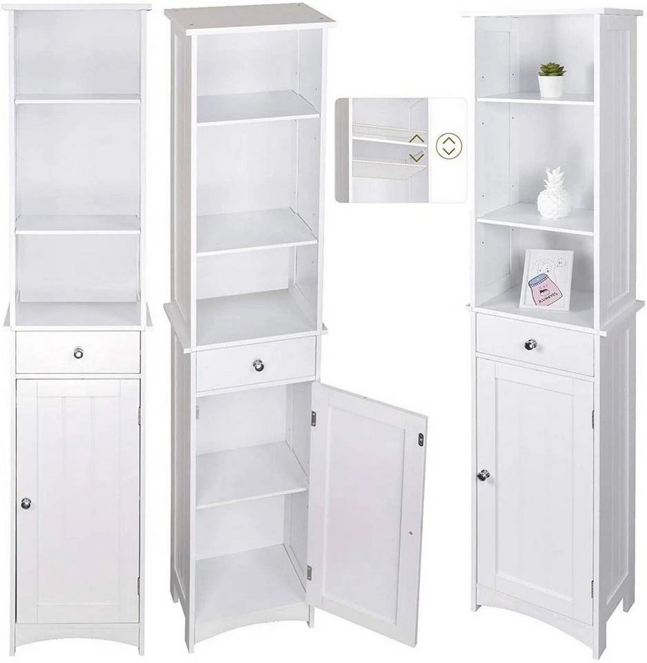 - Mit einer Tür, drei offenen Fächern sowie einer Schublade vergrößert der Hochschrank den Stauraum Ihres Badezimmers.