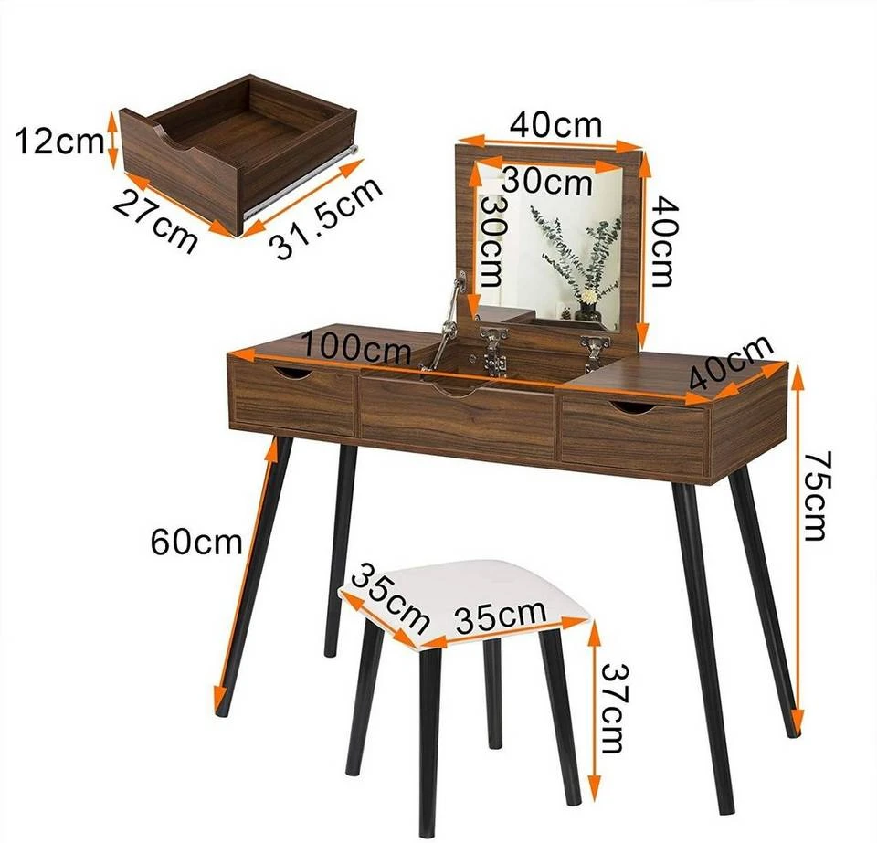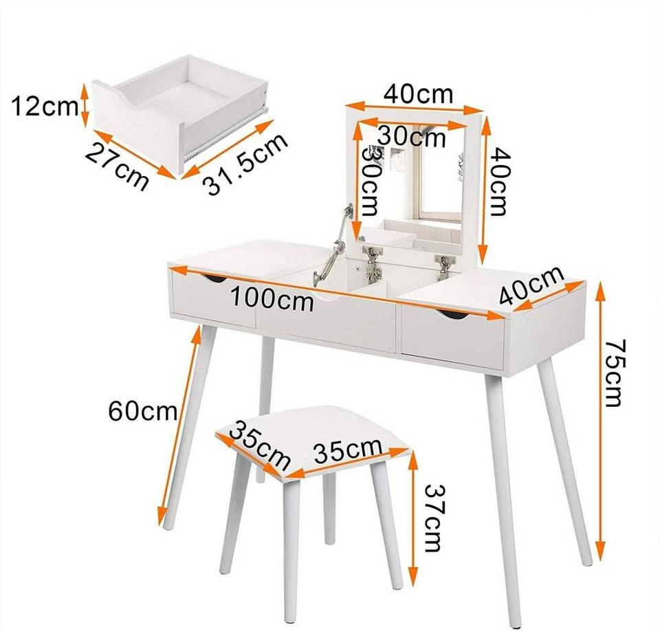 - Lieferumfang: 1 x Schminktisch, 1 x Hocker, 1 x Anleitung