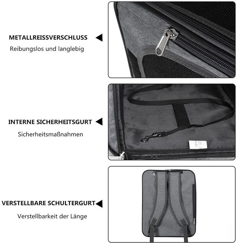- Um die Reisesicherheit zu versprechen und ein Entweichen und Herausspringen von Haustieren zu verhindern, wird empfohlen, Halsbänder oder Hundegeschirre für Haustiere zu tragen und mit dem Sicherheitsgurt in der Tasche zu verbinden.