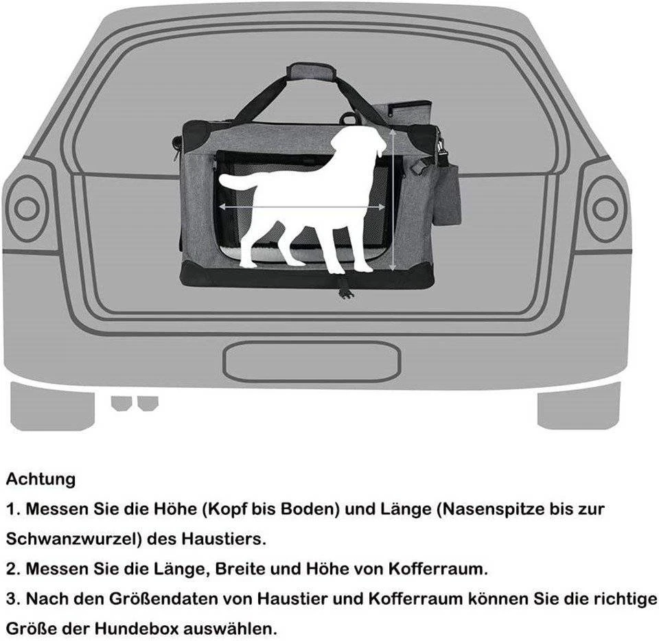 - Bitte messen Sie vor dem Kauf die Größe Ihres Haustieres und Kofferraums, wie die Höhe (KOPF bis BODEN) und Länge (NASENSPITZE bis zur SCHWANZWURZEL) des stehenden Haustiers, die Datei LxBxH (ACHTUNG) von Kofferraum.